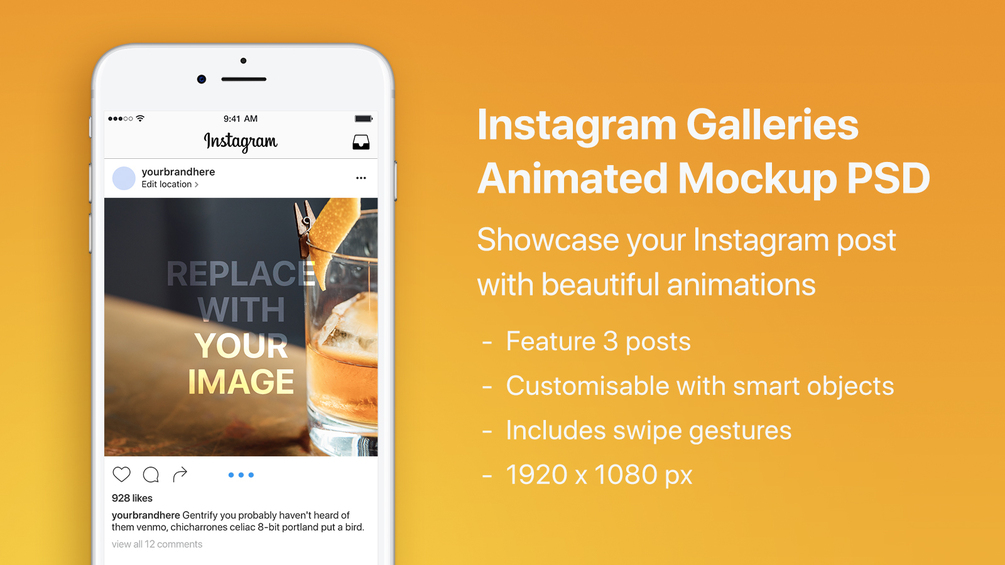Instagram Galleries Animated Mockup is a great way to showcase Instagram's new post format beautifully. PSD file can be exported as GIF or any video format of your choice.